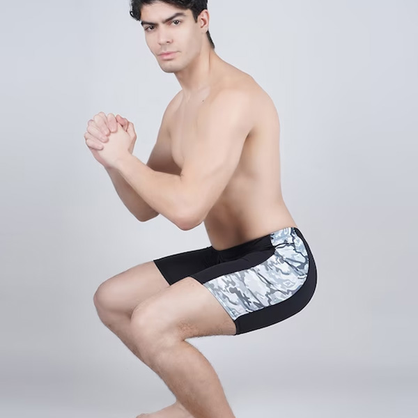 Black solid with printed detail swim shorts, has an elasticated waistband with slip-on closure